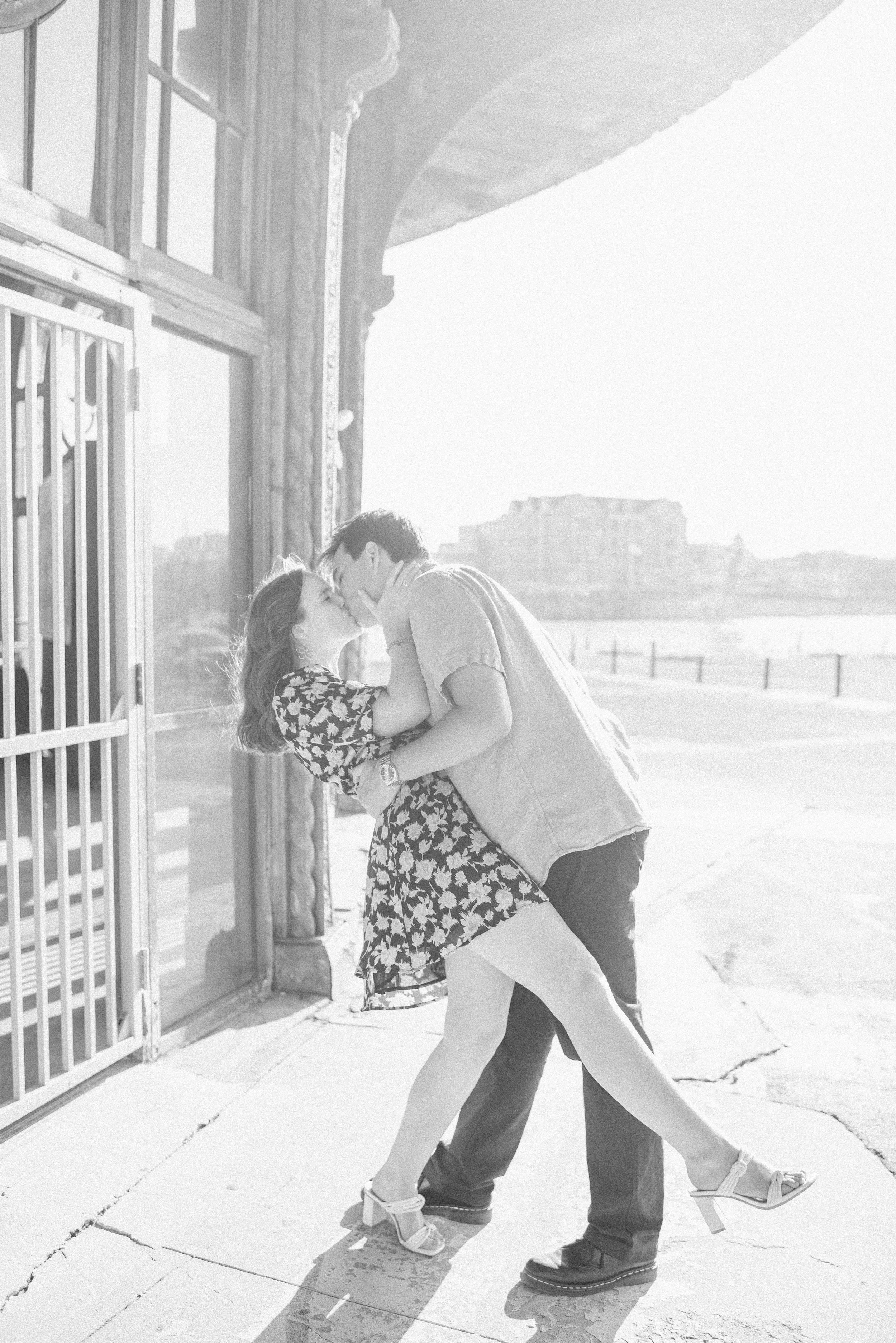 After we explored the boardwalk, we made our way to the beach for some classic shots with the ocean in the background. The couple was barefoot, with the sand between their toes, and they took a quiet walk along the shoreline as the waves gently kissed their feet. It was a simple, yet intimate moment—one that perfectly showcased their love for each other and their shared love for the ocean. After the beach we stopped at some of their special date spots like the famous Stone Pony (a iconic live music venue that has been around for ages in Asbury Park) and the historic carousel.
