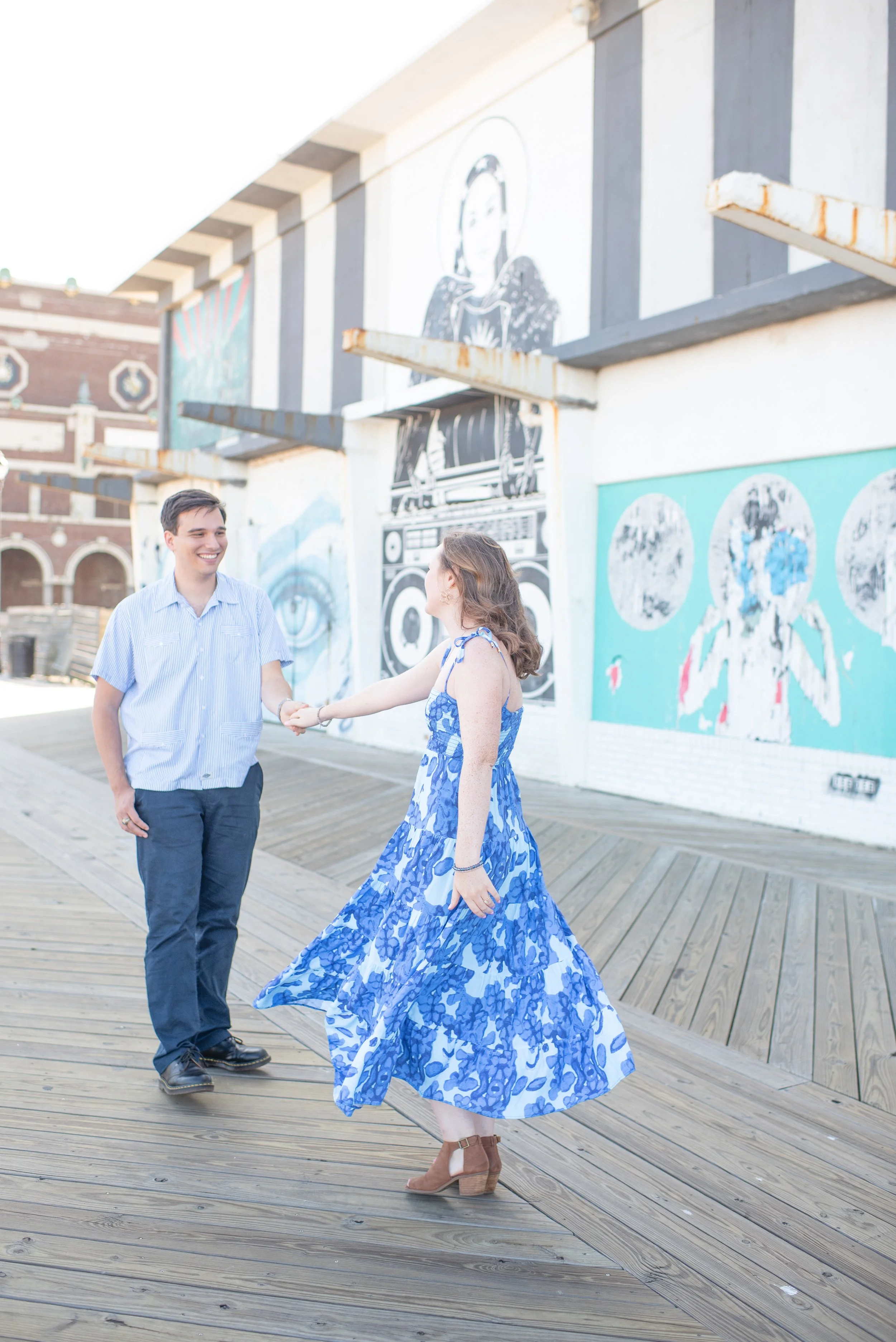 We started the session on the Asbury Park Boardwalk, a place that’s always buzzing with energy. The boardwalk is home to a mix of historic architecture, quirky shops, and street art, creating a playful, dynamic backdrop. The couple was all smiles as they strolled along the boardwalk, hand-in-hand, laughing and enjoying the warmth of the day. The sound of the waves crashing in the distance, the smell of saltwater in the air, and the lively atmosphere of the boardwalk created a perfect energy for capturing candid, natural moments.